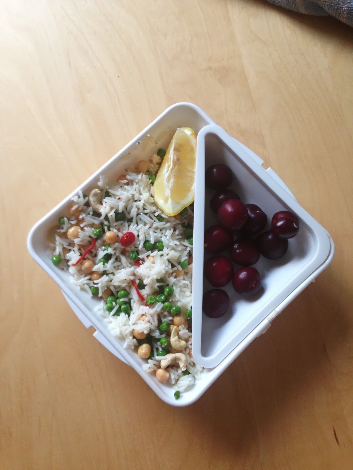 Asian dressed rice, chickpea, pea and cashew salad with cherries. For the Thai dressing I used mirim, rice vinegar, red chili oil, lemon, spring onions and lemongrass.